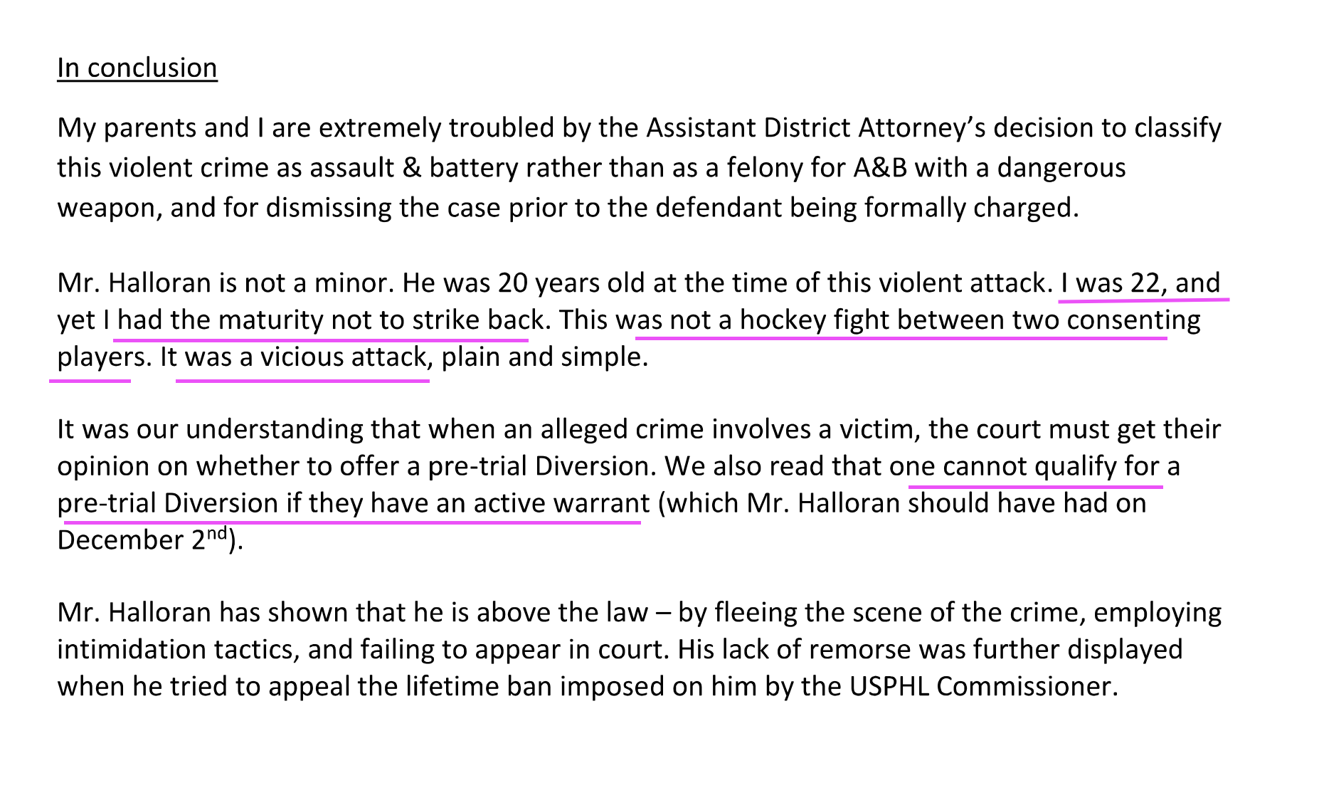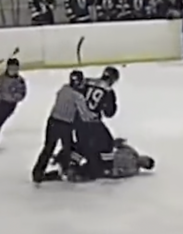 Connolly stated in his decision to drop the charges against Halloran, that he was doing so because of his age (20), the fact that he was getting good grades at Suffolk, and was seeing a shrink to discuss why he felt the need to violently attack referees during games.