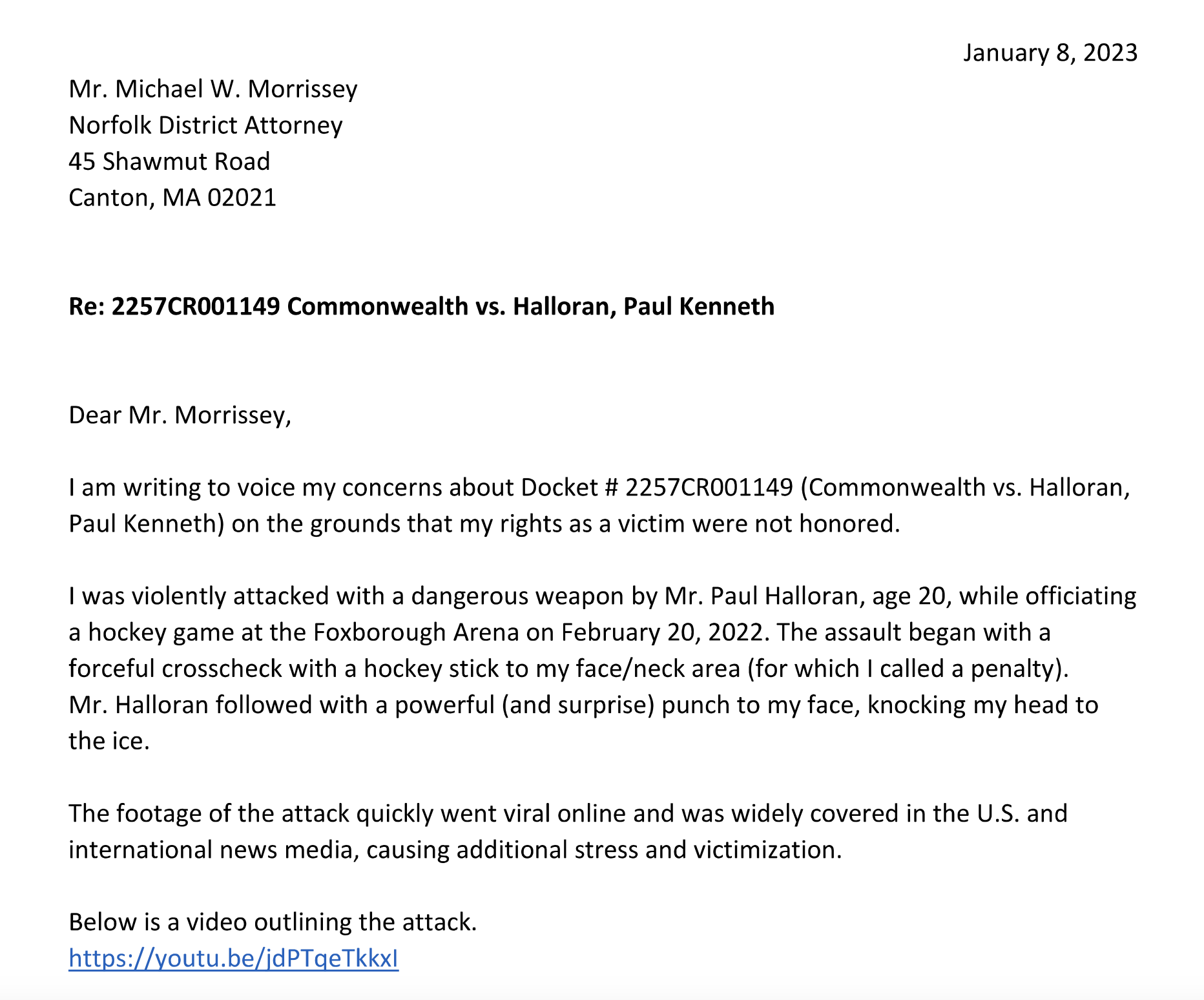 Like Karen Read, he is not from Norfolk County and has no connections there. However, in February of 2022 he traveled to Norfolk County to referee a hockey game in Foxboro. During the game a 20 year old player from one of the teams named Paul Halloran accidentally collided with Gauvin along the boards. No big deal, it happens in hockey. But Halloran took it too far when he then cross checked Gauvin and told him to “get the fuck out of the way, prompting Gauvin to eject him from the game. Halloran didn’t like this so he decided to viciously assault Gauvin by punching him in the face, causing him to fall down and hit his head on the hard as a rock ice.