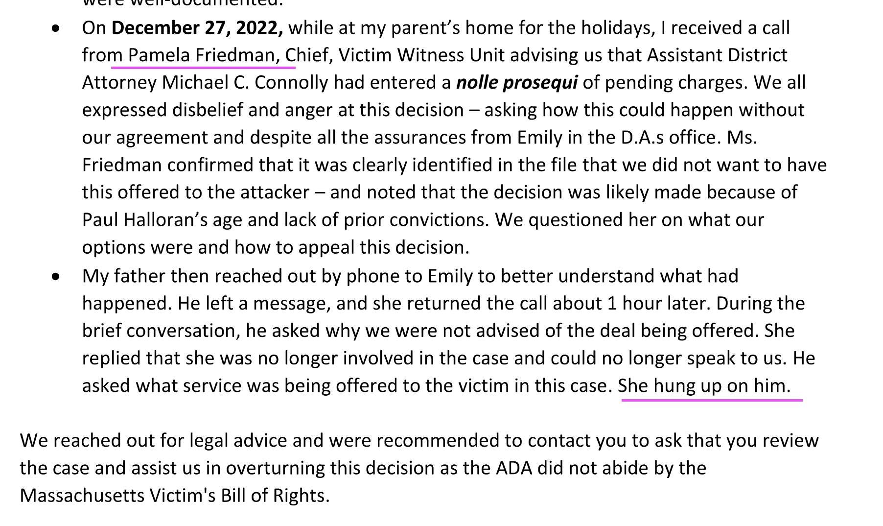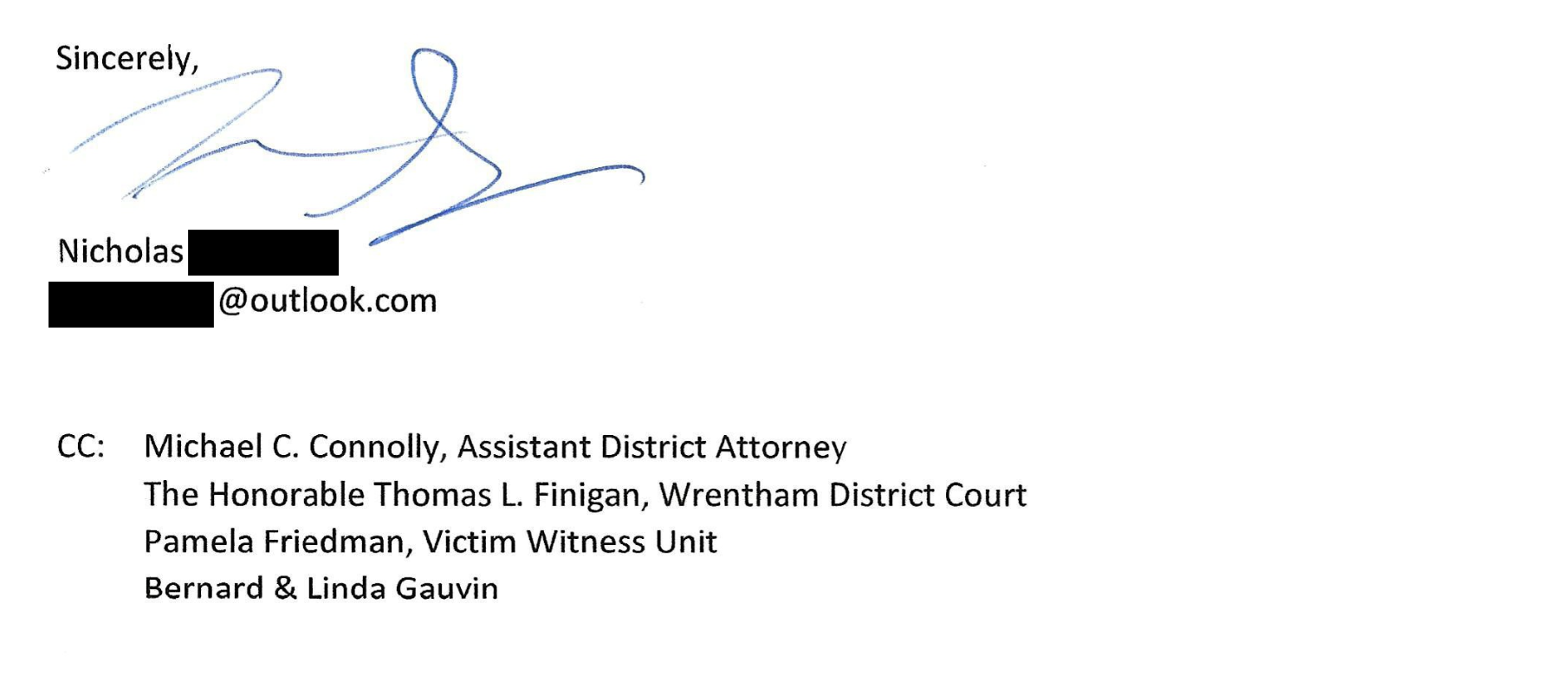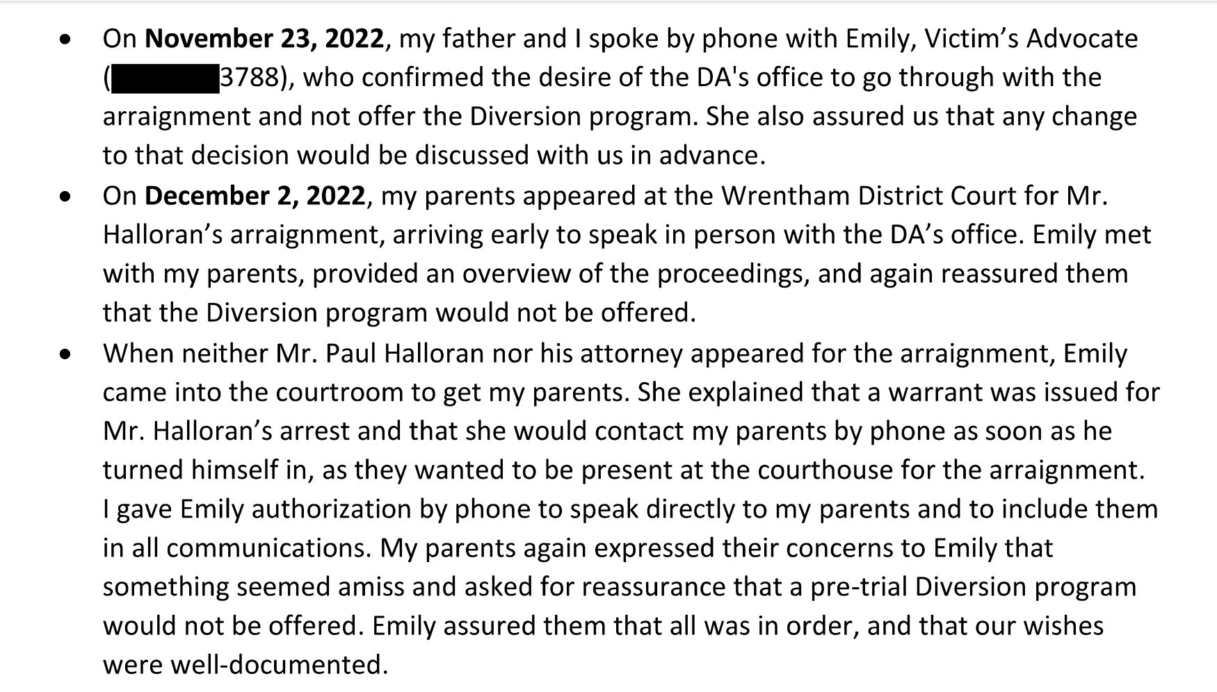 Hidden in the over 4K pages of emails from Michael Morrissey’s burner email account was a letter that Gauvin wrote to Morrissey, which Morrissey did not reply to. The NCDAO got him in touch with his victim witness advocat Emily, who confirmed that Halloran would be charged to the full extent of the law, and that she would discuss any changes to that decision in advance with Gauvin. The arraignment date was set for December 2, but Halloran didn’t show up and a warrant was issued for his arrest. Emily assured Gauvin’s family that the pre-trial diversion slap on the wrist was off the table.