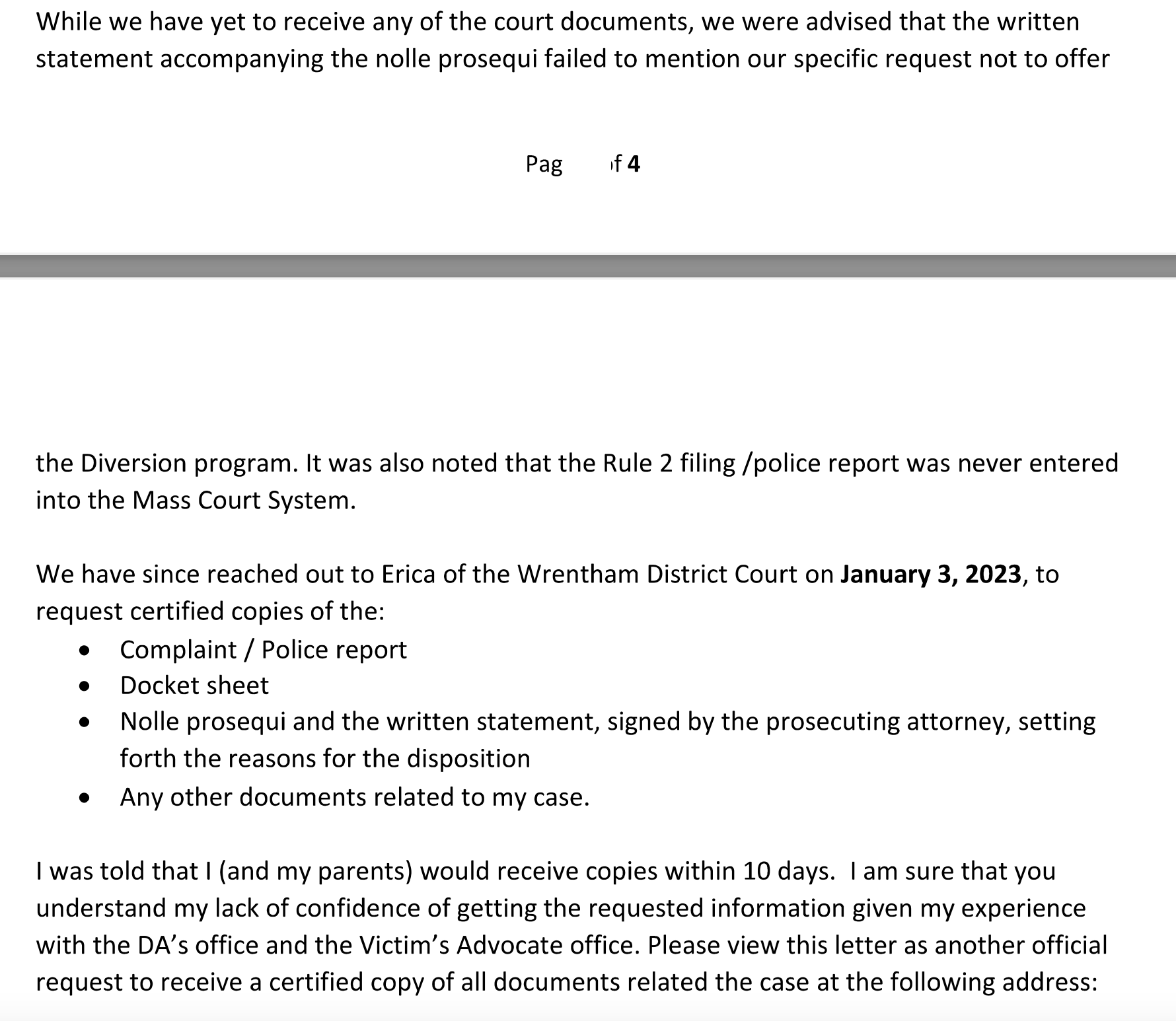 But then on December 27, 2022, Pam Friedman (the victim witness advocate for fake victim Lindsey Gaetani who attends all of my hearings) called Nicholas Gauvin and told him that ADA Michael Connolly had entered a nolle prosequi, meaning that the charges would be dropped. The Gauvin family was upset about this, and Friedman confirmed in the case file that the family specifically said they wanted him charged. Friedman told them to contact victim witness advocate Emily, who told the family she could no longer speak to them and abruptly hung up on them without answering any questions. The family contacted Wrentham District Court, looking for all paperwork related to the case, and were also ignored.