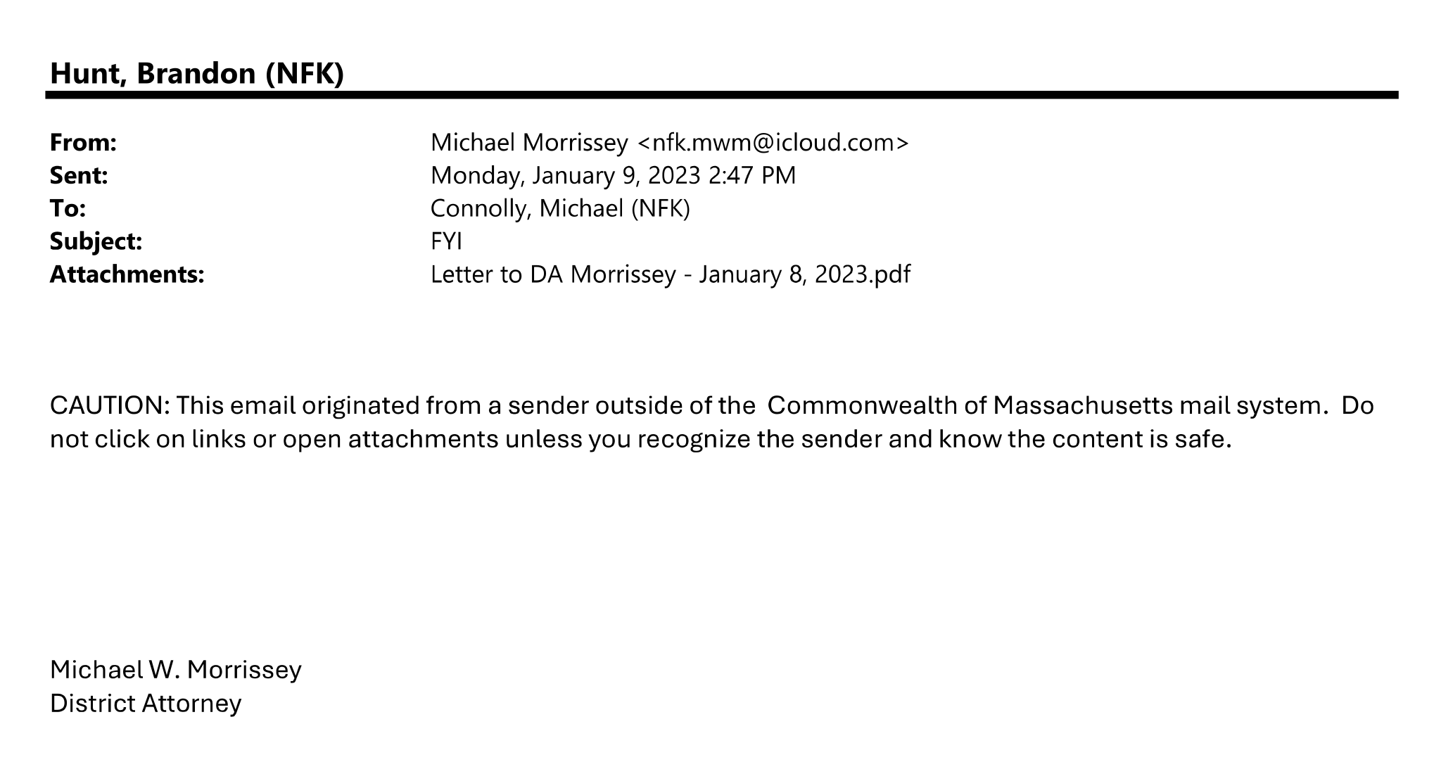 What did Michael Morrissey do with this letter he received from Gauvin? He used his burner email account to send it to Connolly with the subject “FYI.”