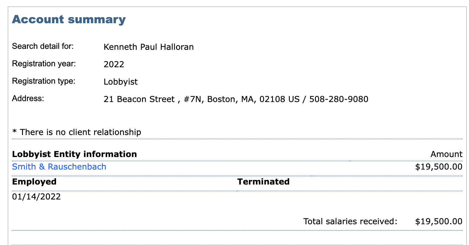 According to the Boston Globe, Ken Halloran was the State Police’s government relations director for 14 years, serving as its “point person” with legislators, their staff, and executive branch agencies, according to a bio posted by the lobbying firm where he’s now partner.