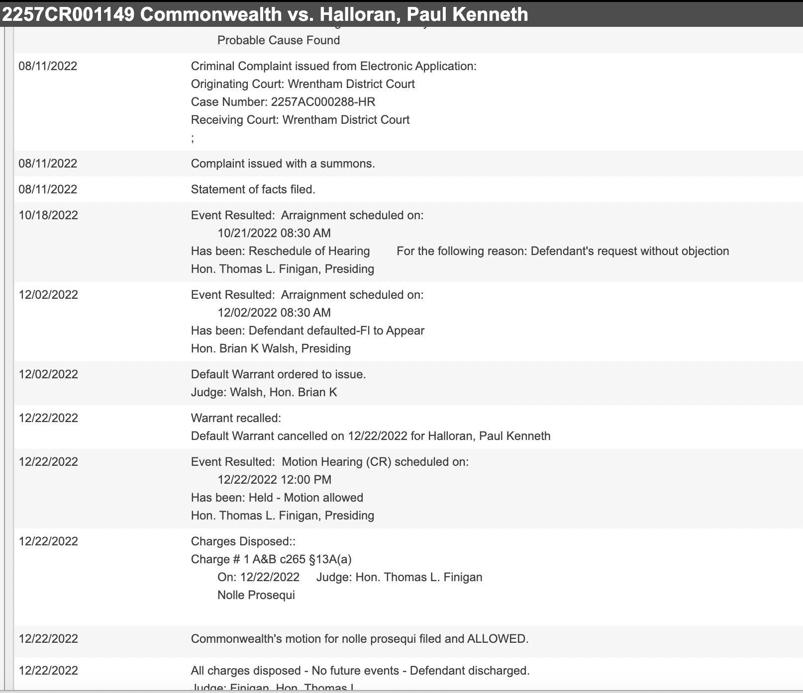 Nor surprisingly, the former State Police Detective Lieutenant, current attorney, and lobbyist who spends holidays with Maura Healey, knew to get his son out of there quickly after he assaulted Nicholas Gauvin. The Foxboro Police filed a criminal complaint immediately after watching the video, but the clerk magistrate hearing date to establish probable cause on June 15, 2022 was postponed. On November 22, 2022 Gauvin was told that the probable cause hearing had taken place, and that probable cause was found to charge Halloran with misdemeanor assault and battery.