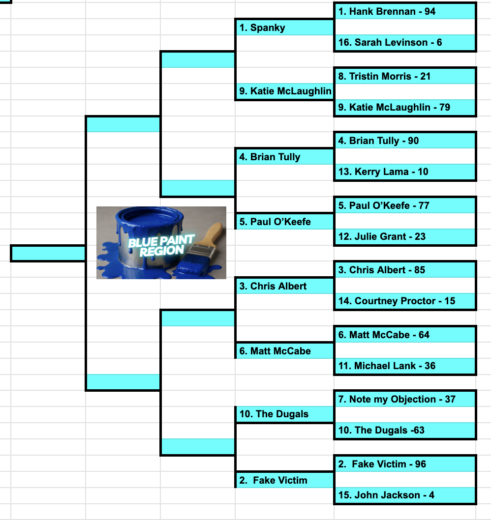 There haven’t been many upsets this year, which means the seeding was top caliber on my part. But the decisions are about to get a lot harder next round. I honestly have no idea if Brian Albert or Auntie Bev will advance. Should be one of the hardest choices of the tournament.