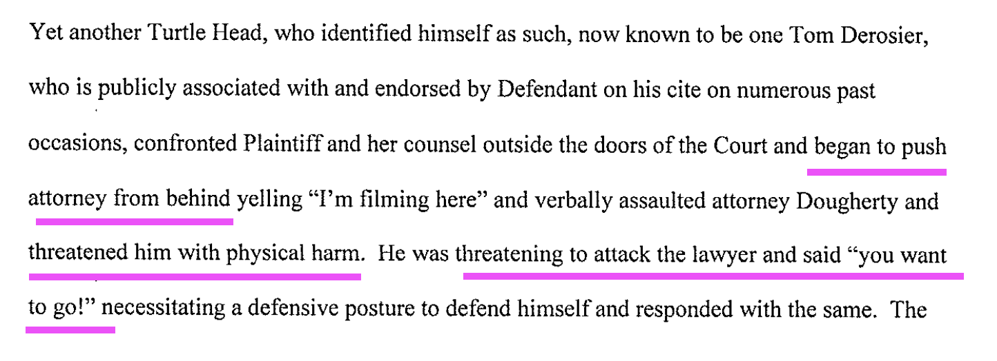 I will go over this filing in more detail on the Live Show this weekend, but for now I will leave you with this gem. Attorney Dougherty has made himself a witness in this case by filing this motion to close the courtroom, since his basis for doing so is that he was harassed and assaulted by me, another journalist, and my supporters. He blatantly lied in the filing by claiming that a “turtle head” named Tom Derosier pushed him from behind, threatened him with physical harm, and threatened to attack Dougherty by saying “you want to go?”